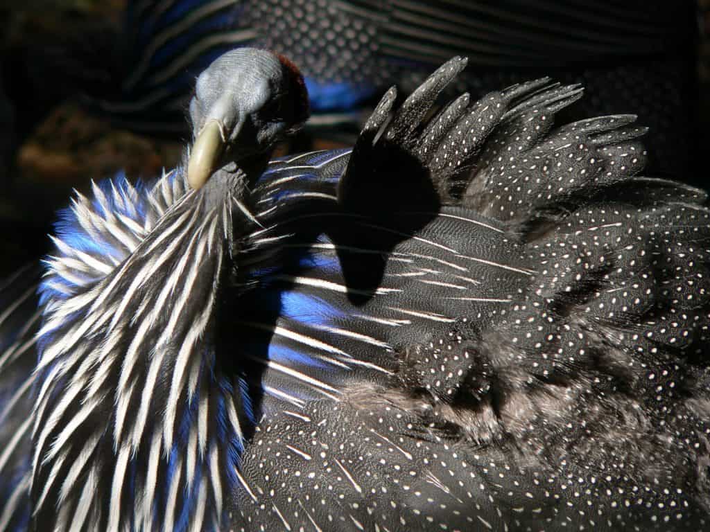 Il blu nella faraona avvoltoio deriva da microscopiche strutture di piume che diffondono la luce, non i pigmenti.
