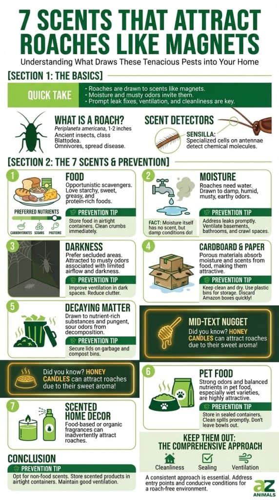 Scopri i 7 profumi che attirano gli scarafaggi, dal cibo e l’umidità agli attrattivi sorprendenti come le candele al miele, e apprendi strategie di prevenzione efficaci.