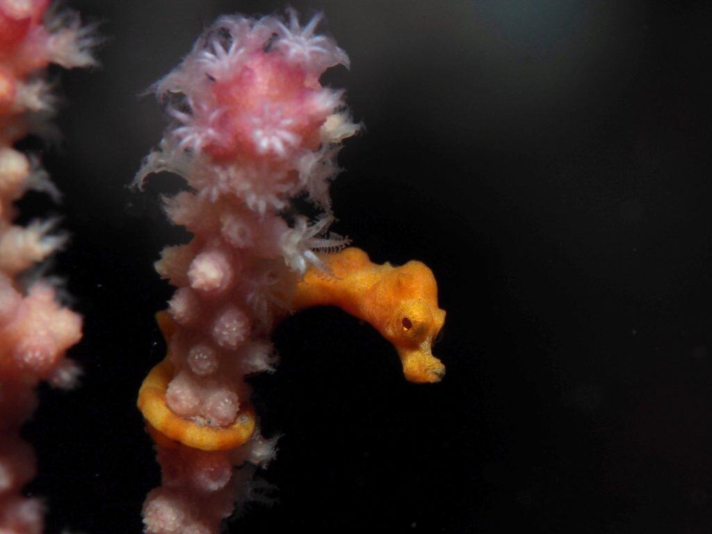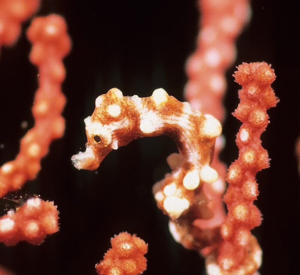 Le protuberanze rialzate e la colorazione precisa consentono a questo cavalluccio marino di imitare quasi perfettamente il corallo ospite.